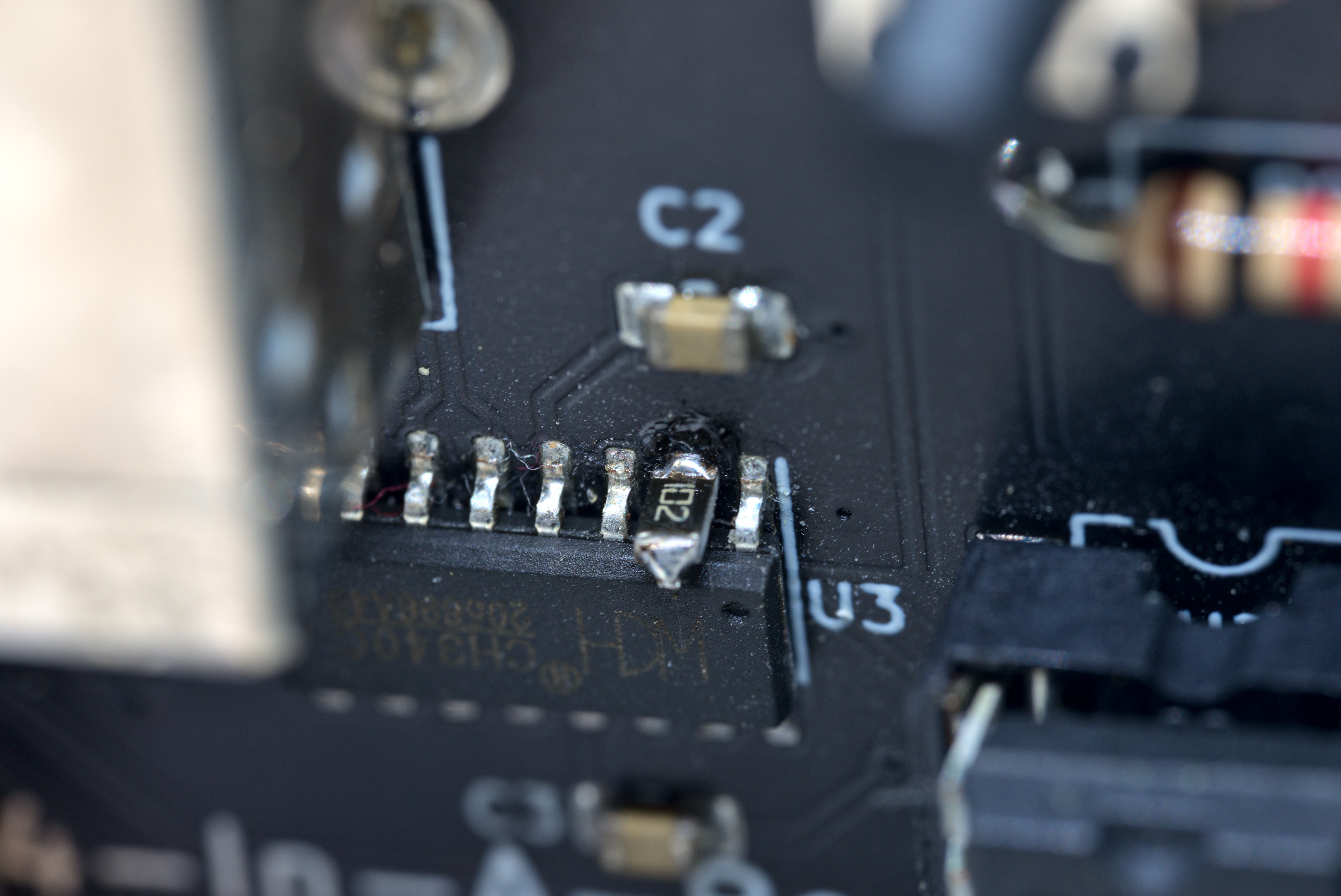 A hardware bug exists where if the CH340C is soldered, due to the CH340 pulling it's pin 2 high nominally, it conflicts when a button is pressed (which drives the pin low). This can be either mitigated by not installing the CH340, or fixed by bending CH340's pin upwards and installing a 1k resistor between the pin and the pad as shown below: