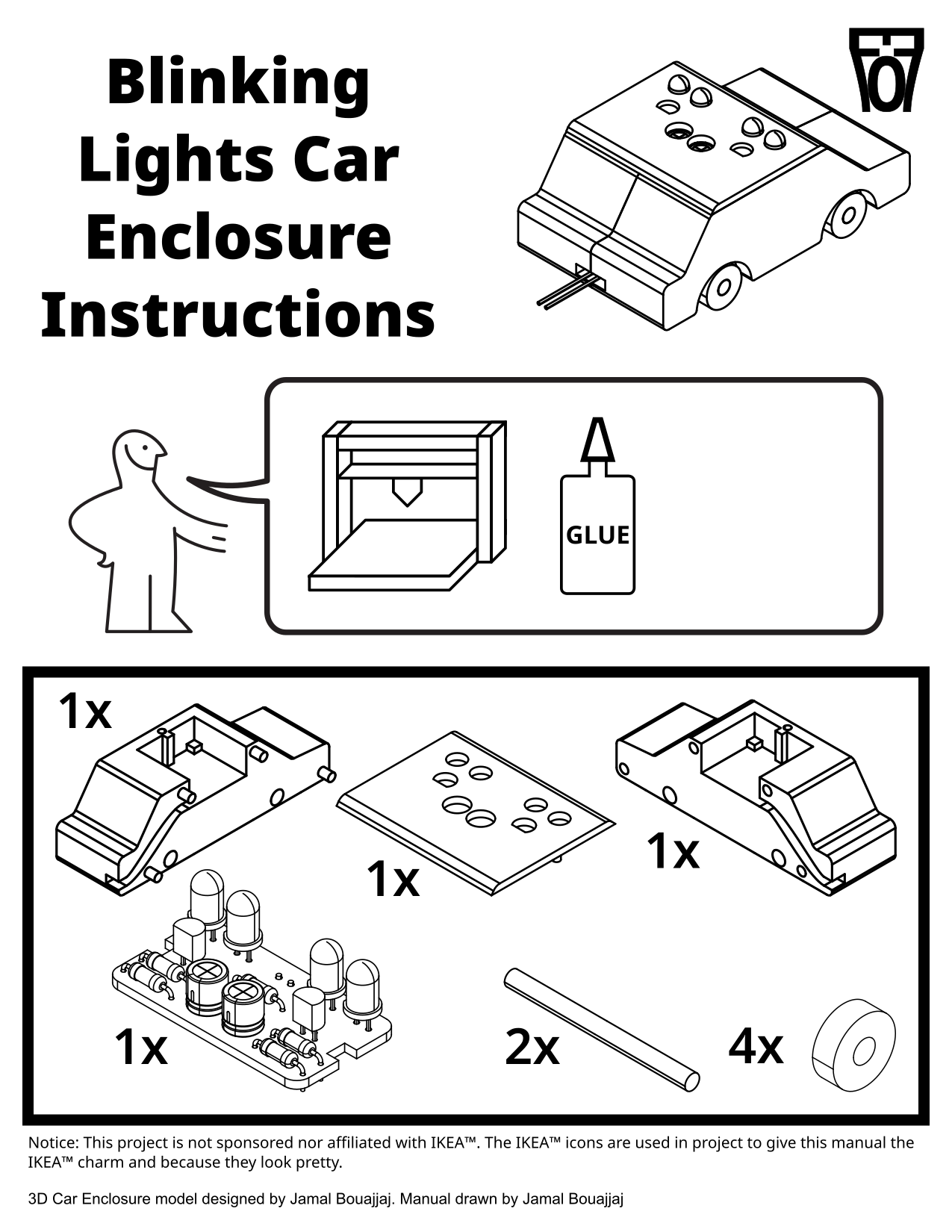 If you have access to a 3D printer, you could print a nice enclosure for this kit (as a nice finishing touch). There are currently two models: A rectangular enclosure and a car enclosure.