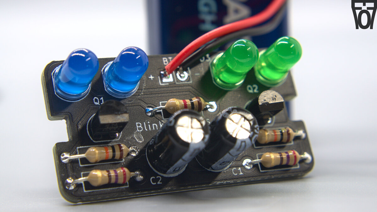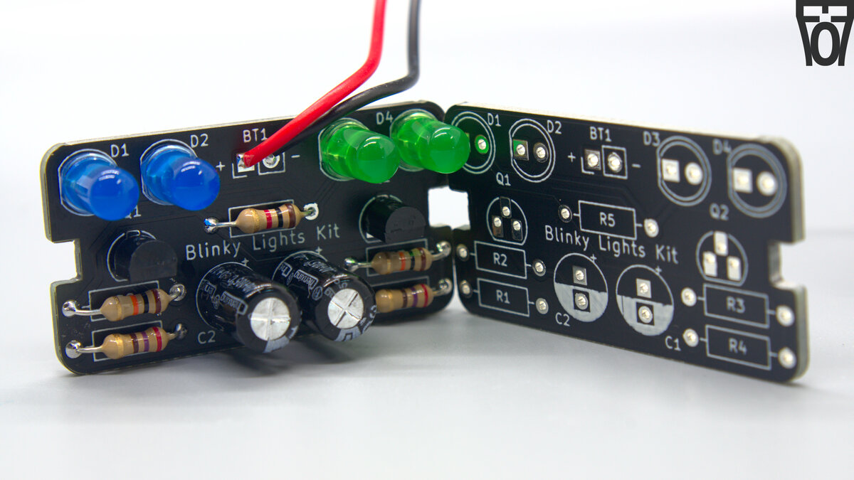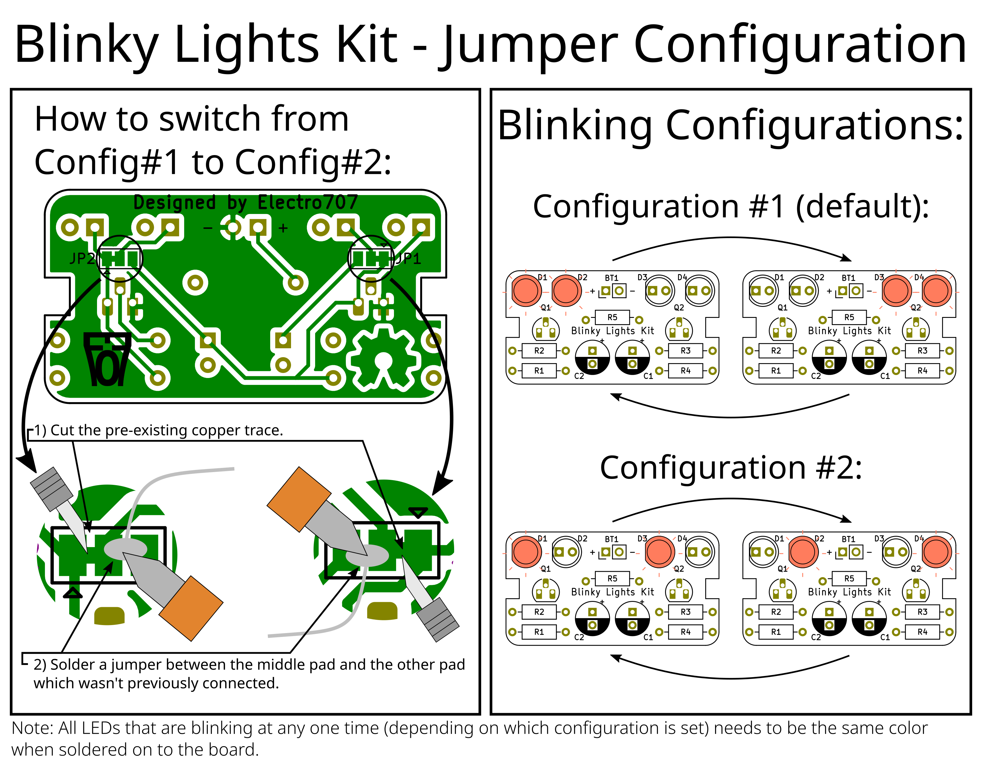 I am connecting 2 LED's cathods to each transistor with a series current limiting resistor (without the resistor, the LEDs would cease to light, maybe even release the magic smoke if you're lucky). Which 2 of the 4 LEDs that are connected to a particular transistor (and thus will blink together) is dependent on the jumper configuration. This is also why the intructions specify to make the LEDs that are blinking simoltanously the same color, as if a blue and red LED for example are connected to the same current-lmiting resistor, the blue LED will not light up but the red one will (due to the LED's different fowards voltage drop, ~2.2v for a red LED and ~3.2v for a blue LED).