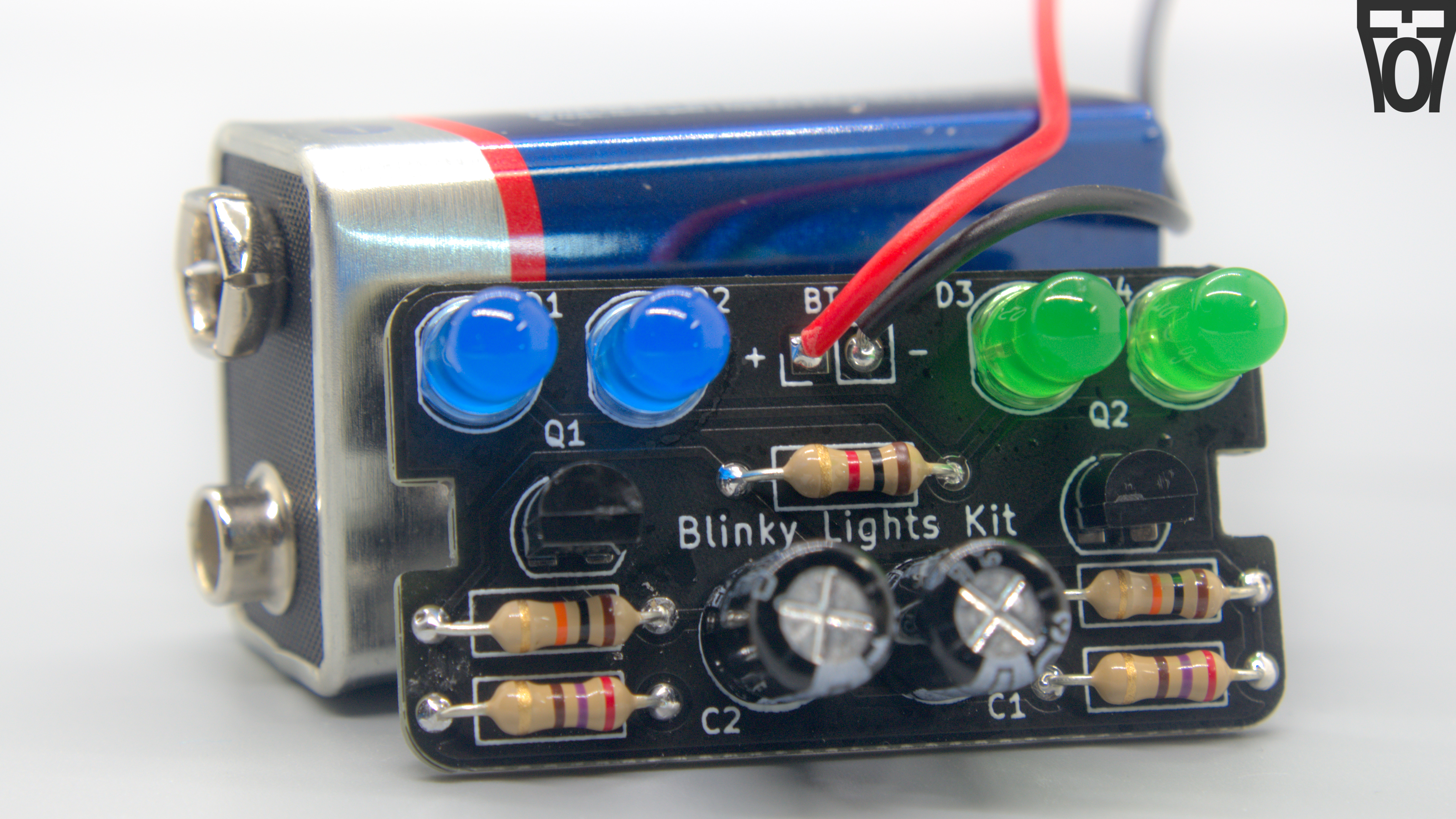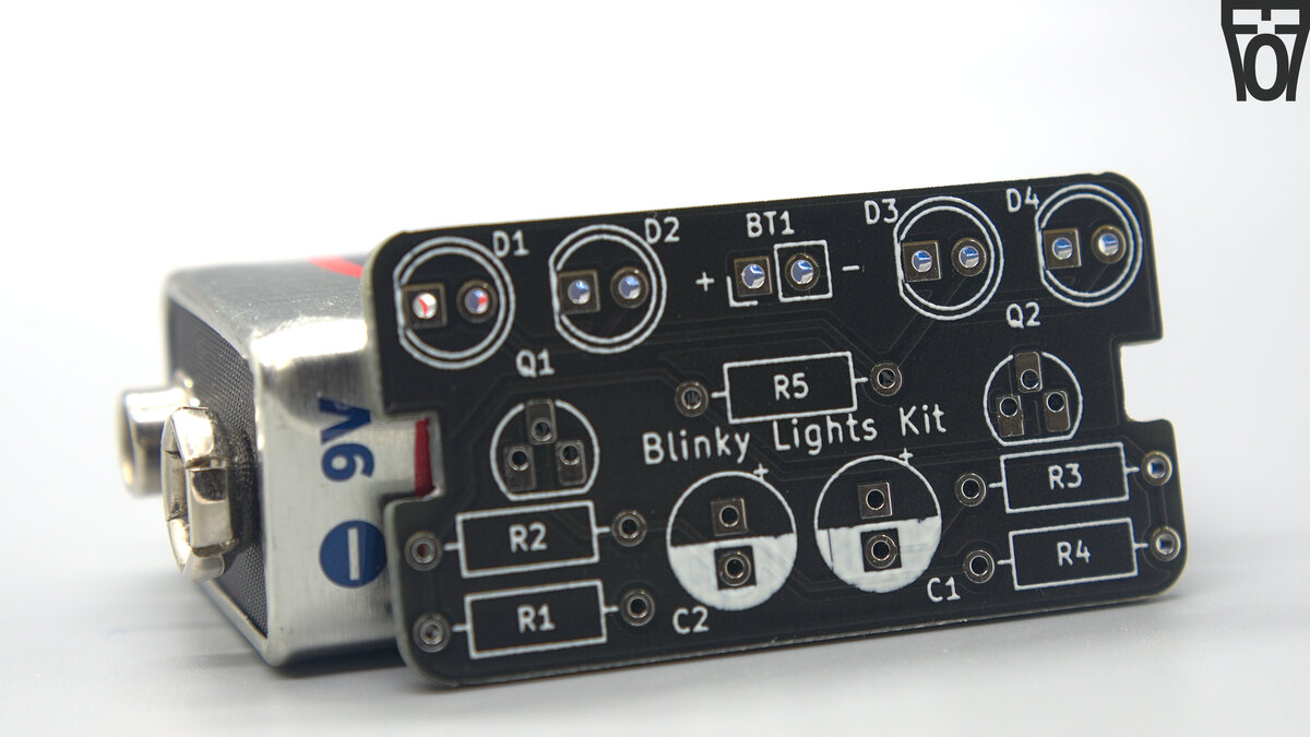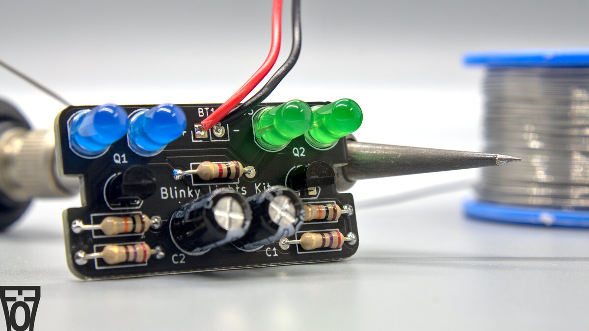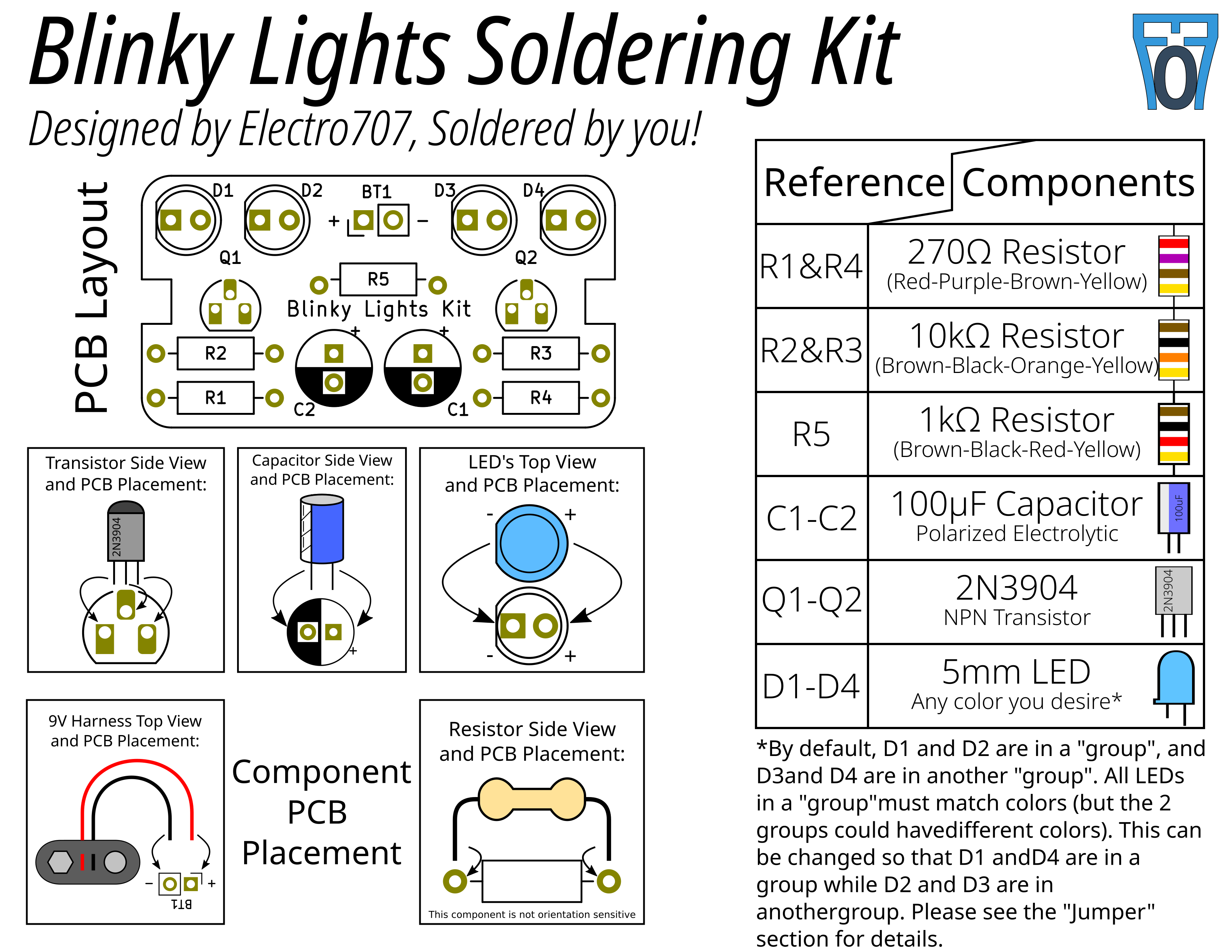 I am connecting 2 LED's cathods to each transistor with a series current limiting resistor (without the resistor, the LEDs would cease to light, maybe even release the magic smoke if you're lucky). Which 2 of the 4 LEDs that are connected to a particular transistor (and thus will blink together) is dependent on the jumper configuration. This is also why the intructions specify to make the LEDs that are blinking simoltanously the same color, as if a blue and red LED for example are connected to the same current-lmiting resistor, the blue LED will not light up but the red one will (due to the LED's different fowards voltage drop, ~2.2v for a red LED and ~3.2v for a blue LED).